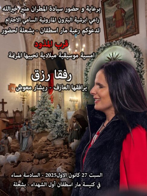 الأمسية تحييها المرنّمة رفقا رزق بمشاركة العازف ريشارد معوّض، في أجواء روحية وموسيقية تعبّر عن معاني الميلاد ورسالة الفرح والرجاء التي يحملها هذا الموسم.