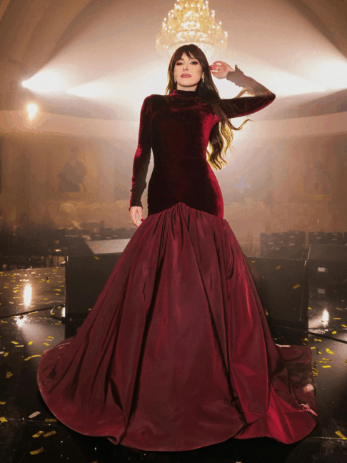 تميّز التصميم بتوليفة ذكية من المخمل الفاخر في الجزء العلوي، ما منح القوام انسيابية منحوتة بدقّة، بينما أتت التنّورة الضخمة من التفتا لتضيف بعداً مسرحيّاً ناعماً، ينساب مع الحركة، ويعكس الضوء بأسلوب شاعريّ. هذا التوازن بين البنية الصارمة والأنوثة المتدفّقة يعكس بوضوح هوية رامي قاضي في تصميم الكوتور.