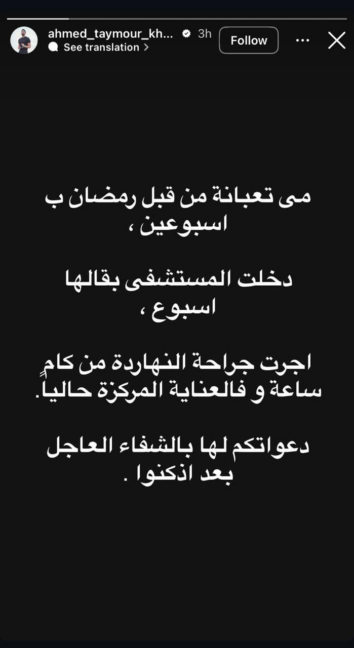 حيث أكد عبر حسابه الرسمي في إنستغرام أن مي كانت تعاني من التعب منذ ما قبل شهر رمضان بأسبوعين, ودخلت المستشفى منذ أسبوع كامل لتستقر حالياً في غرفة العناية المركزة تحت الملاحظة الطبية الدقيقة.