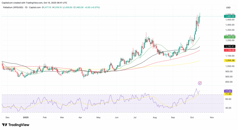 في ظل بريق الذهب والفضة، يبرز معدن آخر بدأ يحقق أداءً قوياً في الأسابيع الأخيرة. فقد ارتفع سعر البلاديوم (XPD/USD) بنسبة 26% منذ بداية الشهر، ليصل إجمالي ارتفاعه إلى نحو 70% منذ أدنى مستوياته في نيسان الماضي. ومع ذلك، لا يزال بعيداً عن أعلى مستوى تاريخي له البالغ 3,440 دولاراً الذي سجله في عام 2022.