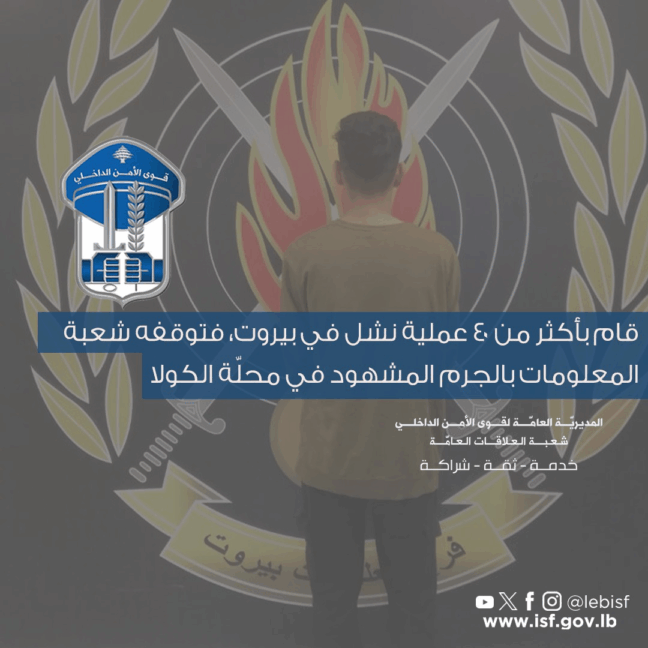 بتاريخ 08- 12- 2025 وبعد عملية رصد ومراقبة دقيقة، تمكّنت إحدى دوريات شعبة المعلومات من توقيفه بالجرم المشهود في محلّة الكولا أثناء محاولته نشل أحد المواطنين.
