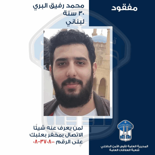 تعمِّم المديريّة العامّة لقوى الأمن الدّاخلي، بناءً على إشارة القضاء المختص، صورة المفقود: محمد رفيق البري (مواليد عام 1996، لبناني) الذي غادر بتاريخ 21-01-2026 منزله الكائن في بعلبك – رأس العين، علمًا أنّه يعاني من مرض نفسي (اضطراب ثنائي القطب).