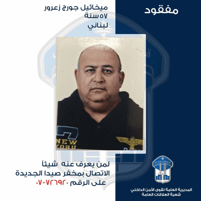 عمّمت المديريّة العامّة لقوى الأمن الدّاخلي، بناءً على إشارة القضاء المختصّ، صورة المفقود: ميخائيل جورج زعرور (مواليد عام 1968، لبناني) الذي غادر بتاريخ 10-12-2025، منزله الكائن في بلدة درب السيم - صيدا، ولم يَعُد لغاية تاريخه.