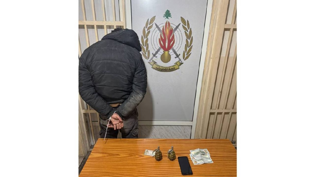 تمكّنت إحدى دوريات الشعبة، بتاريخ 30-12- 2024، وبعد عملية رصد ومراقبة دقيقة، من توقيفه في محلة سهل حلبا، وبتفتيشه عثرت بحوزته على قنبلتَين يدويَّتَين.