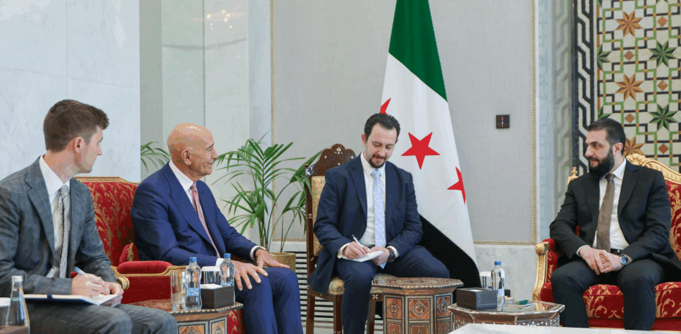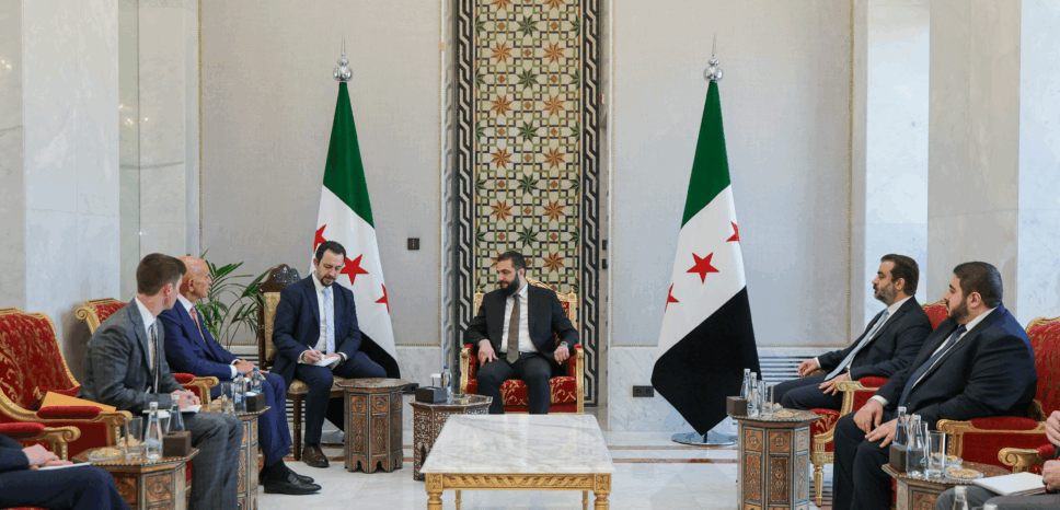 استقبل الرئيس السوري أحمد الشرع اليوم الاربعاء في قصر الشعب بدمشق وفدًا أميركيًا برئاسة المبعوث الأميركي الخاص إلى سوريا توم برّاك، بحضور وزير الخارجية والمغتربين أسعد الشيباني، حيث تمّ بحث التطورات الأخيرة في المنطقة والقضايا ذات الاهتمام المشترك.