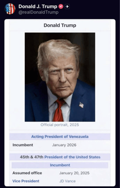 أعلن الرئيس الأميركي دونالد ترامب، في منشور عبر منصة "تروث سوشيال" نفسه حاكما موقتاً لفنزويلا. وفي تطور لافت، نشر ترامب صورة له من ويكيبيديا تحت عنوان "رئيس فنزويلا بالوكالة"، ملمّحاً بسخرية إلى شرعية ديلسي رودريغير، نائب الرئيس نيكولاس مادورو، والتي تولّت زمام السلطة بعد اعتقاله في 3 كانون الثاني على يد قوة أميركية خاصة.