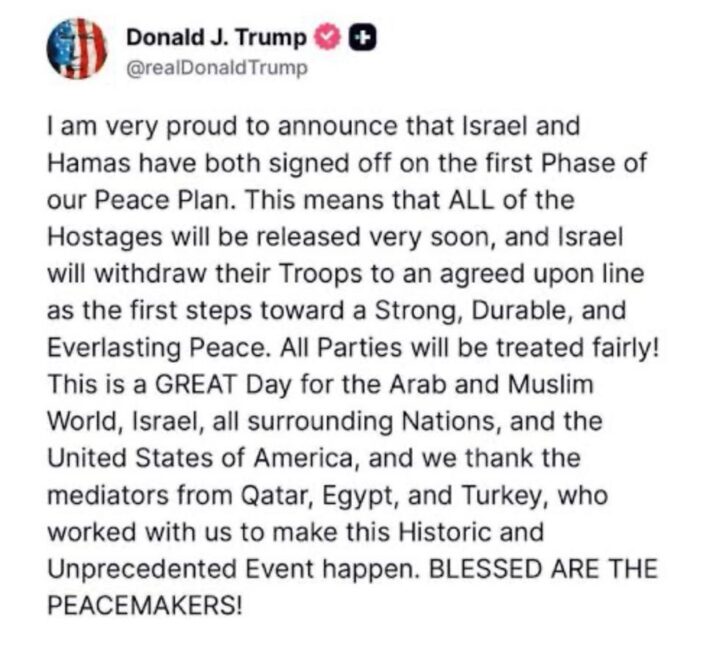 أعلن الرئيس الأميركي دونالد ترامب أن "إسرائيل وحماس وقعتا على المرحلة الأولى من خطتنا للسلام".