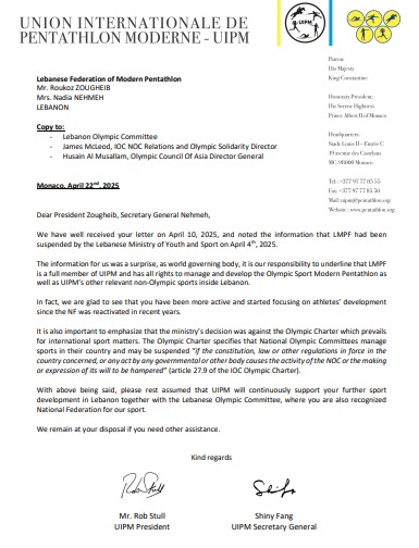 وقال الكتاب الدولي حرفياً: "بصفتنا هيئة حاكمة عالمية، فمن مسؤوليتنا التأكيد بأنّ الاتحاد اللبناني للخماسي الحديث هو عضو كامل العضوية في الاتحاد الدولي للخماسي الحديث، وله جميع الحقوق في إدارة وتطوير رياضة الخماسي الحديث الأولمبية، بالإضافة إلى الرياضات غير الأولمبية الأخرى ذات الصلة بالاتحاد الدولي للرياضات الأولمبية (UIPM) داخل لبنان.