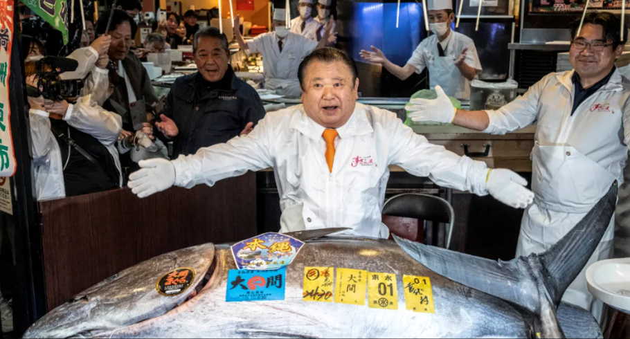 بيعت سمكة تونة ذات زعانف زرقاء تزن 243 كيلوغراما بسعر قياسي بلغ 510 ملايين ين (3.2 مليون دولار) في المزاد الأول لعام 2026 في سوق تويوسو للأسماك بطوكيو.