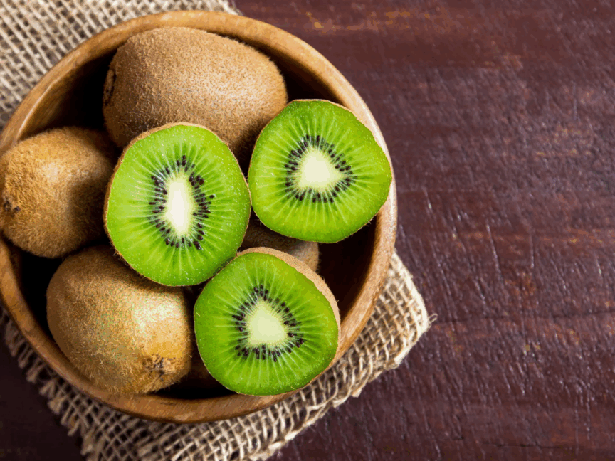 الكيوي غني بفيتامين سي، كما يحتوي على الألياف والبوتاسيوم، وهما عنصران يساعدان في تقوية المناعة وتقليل الالتهاب. وهو خيار جيد وسهل الإدخال إلى النظام الغذائي اليومي.