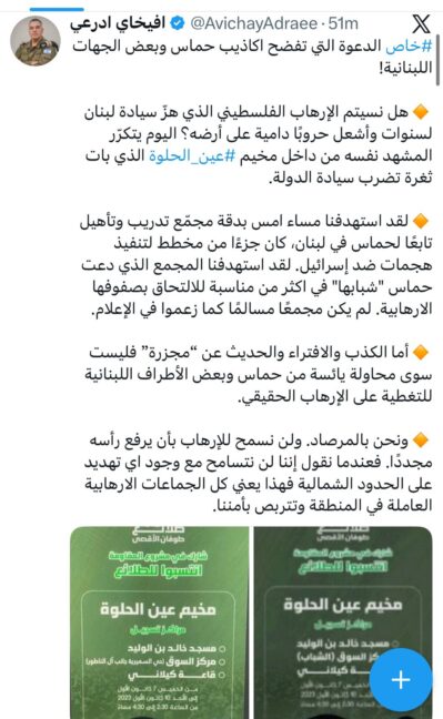 أما الكذب والافتراء والحديث عن “مجزرة” فليست سوى محاولة يائسة من حماس وبعض الأطراف اللبنانية للتغطية على الإرهاب الحقيقي.