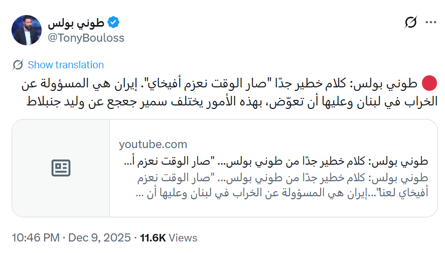 ردّ المتحدث باسم الجيش الإسرائيلي أفيخاي أدرعي على الصحافي طوني بولس عبر منصة "إكس"، وذلك عقب منشور للأخير اعتبر فيه أنّ "إيران مسؤولة عن الخراب في لبنان وعليها أن تعوّض"، مضيفًا أنّ "بهذه الأمور يختلف سمير جعجع عن وليد جنبلاط".