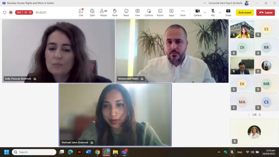 نُظّمت بالتعاون مع مبادرة المبادئ التعليمية للإدارة المسؤولة (PRME) وكلية إدارة الأعمال في جامعة القديس يوسف. تضمنت الندوة جلستين حواريتين، الأولى حول دمج حقوق الإنسان في ممارسات الشركات، أدارها الدكتور محمد مكي من جامعة الروح القدس، والثانية حول التوظيف الشامل وأدارتها الدكتورة ريما روحانا من جامعة القديس يوسف، بمشاركة خبراء محليين ودوليين.