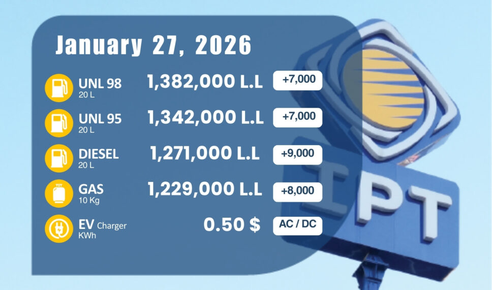إرتفع سعر صفيحتَي البنزين 85 و98 أوكتان 7000 ليرة لبنانية والمازوت 9000 ليرة والغاز 8000.وأصبحت الأسعار على الشكل التالي:- البنزين 95 أوكتان: 1.342.000 ليرة لبنانية- البنزين 98 أوكتان: 1.338.000 ليرة لبنانية- المازوت: 1.271.000 ليرة لبنانية- الغاز: 1.229.000 ليرة لبنانية