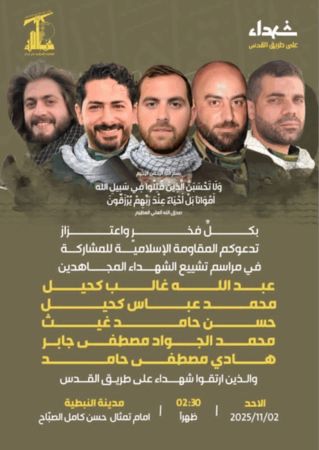 نعى حزب الله، اليوم الأحد، عناصره الذين قتلوا بغارة النبطية مساء أمس، وهم عبد الله غالب كحيل، محمد عباس كحيل، حسن حامد غيث، محمد الجواد مصطفى جابر وهادي مصطفى حامد.