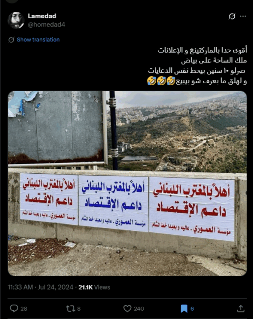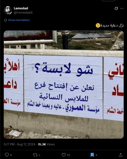 الصورة الأصلية تعود إلى تموز 2024، وتُظهر ملصقات كُتب عليها: "أهلا بالمغترب اللبناني داعم الاقتصاد – مؤسسة العموري – عاليه وبعبدا خط الشام"، وليس أي تهنئة لممداني، بحسب ما أظهر البحث العكسي على الإنترنت الذي قاد إلى حساب homedad4@ على منصة إكس، حيث نُشرت النسخة الأصلية لأول مرة.
