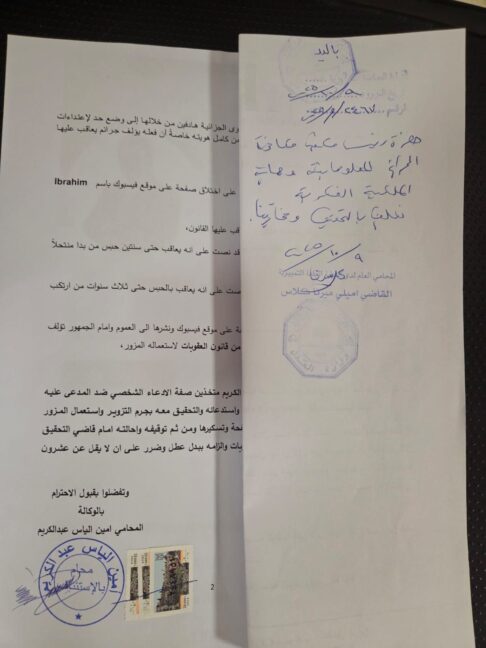 تقدّم النائب ابراهيم كنعان بواسطة وكيله المحامي أمين عبد الكريم بشكوى امام النيابة العامة التمييزية، بتاريخ ٩/١٠/٢٠٢٥، بانتحال صفة والتزوير واستعمال مزوّر وتصل عقوبتها الى ٣ أشهر سجن بموجب المادة ٣٩١ من قانون العقوبات، وذلك ضد من أنشا صفحة على فايسبوك كتب عليها "Ibrahim Kanaan- القوات اللبنانية الحرة".