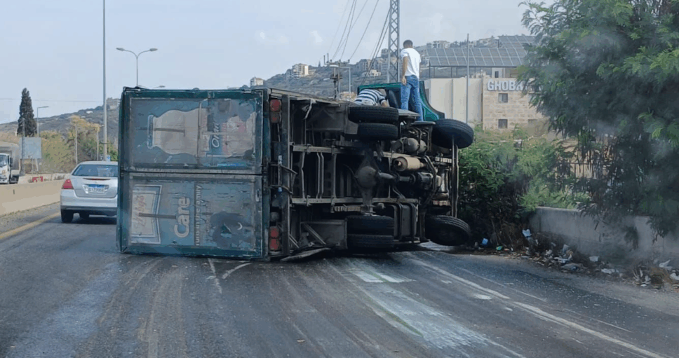 بالصورة: انقلاب شاحنة.. وزحمة سير على أوتوستراد عمشيت