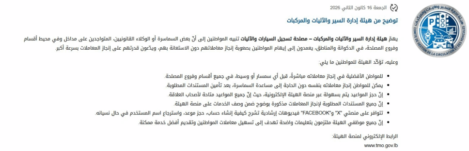 أعلنت هيئة إدارة السير والآليات والمركبات - مصلحة تسجيل السيارات والآليات، في بيانٌ عن أن: "يهم الإدارة تنبيه المواطنين إلى أن بعض السماسرة أو الوكلاء القانونيين المتواجدين على مداخل وفي محيط أقسام وفروع المصلحة في الدكوانة والمناطق، يعمدون إلى إيهام المواطنين بصعوبة إنجاز معاملاتهم دون الاستعانة بهم، ويدعون قدرتهم على إنجاز المعاملات بسرعة أكبر.