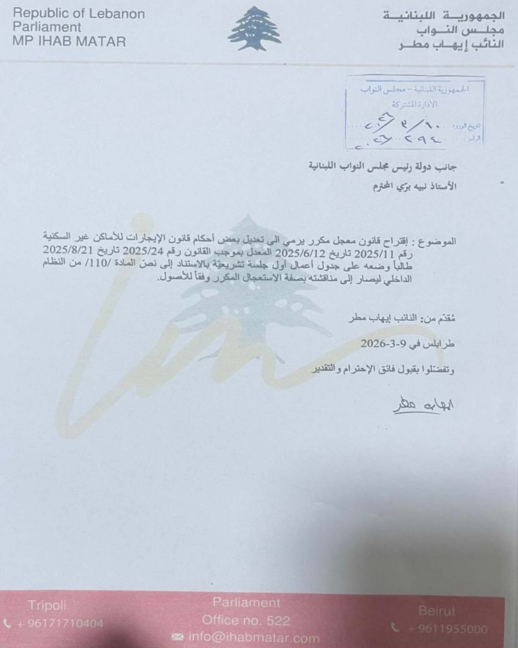 كتب النائب ايهاب مطر، عبر منصة "اكس": تقدمتُ وزملائي النواب: أشرف ريفي، وليد البعريني، وأحمد رستم، باقتراح قانون معجل مكرر يهدف إلى تعديل بعض أحكام قانون الإيجارات للأماكن غير السكنية، طالبين إدراجه على جدول أعمال أول جلسة تشريعية، استنادًا إلى نص المادة 110 من النظام الداخلي، ليصار إلى مناقشته بصفة الاستعجال المكرر".