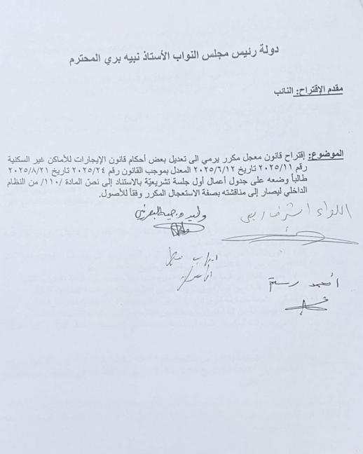 تقدمتُ وزملائي النواب: أشرف ريفي، وليد البعريني، وأحمد رستم، باقتراح قانون معجل مكرر يهدف إلى تعديل بعض أحكام قانون الإيجارات للأماكن غير السكنية، طالبين إدراجه على جدول أعمال أول جلسة تشريعية، استنادًا إلى نص المادة /110/ من النظام الداخلي، ليصار إلى مناقشته بصفة الاستعجال… pic.twitter.com/b9ZQYYBEL8
