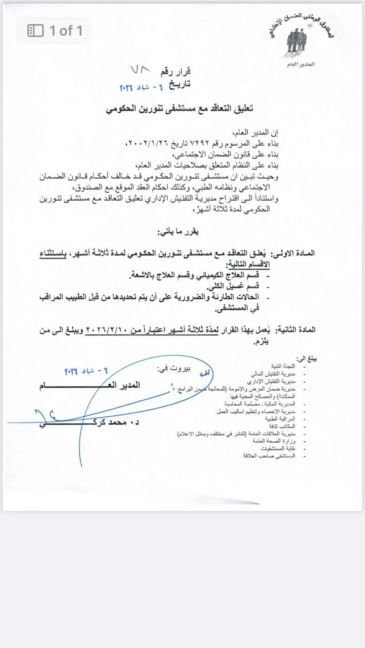 بالوثيقة: الضمان يعلّق التعاقد مع مستشفى تنورين الحكومي