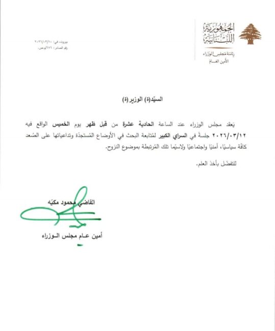 يعقد مجلس الوزراء عند الساعة الحادية عشرة من قبل ظهر اليوم الخميس الواقع فيه 12/3/2026 لمتابعة البحث في الأوضاع المستجدة وتداعياتها على الصعد كافةً سياسياً، أمنياً، وإجتماعياً ولا سيما تلك المرتبطة بموضوع النزوح.