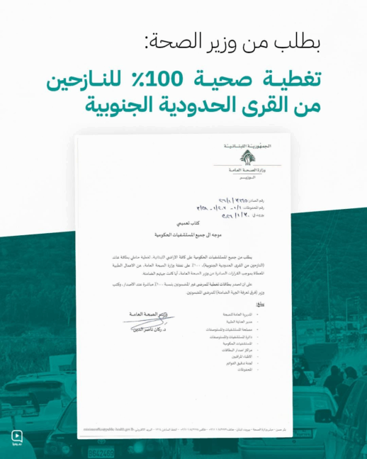 أصدرت وزارة الصحة، تعميماً، موجهاً إلى كل المستشفيات الحكومية على الاراضي اللبنانية كافة، تغطية كلفة النازحين من القرى الحدودية الجنوبية، بنسبة 100% على نفقة وزارة الصحة العامة، عن الأعمال الطبية المعطاة بموجب القرارات الصادرة عن وزير الصحة العامة، أياً كانت جهتهم الضامنة.