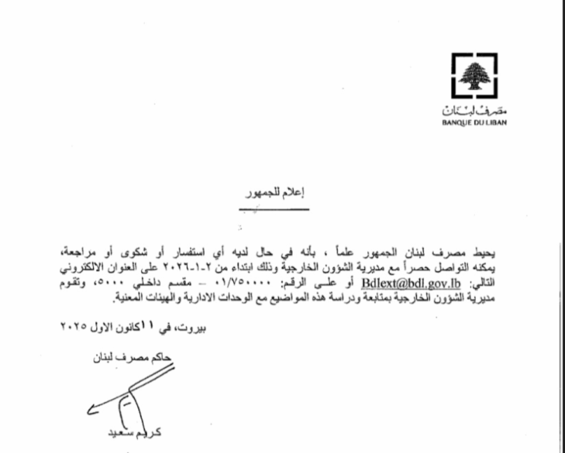 كما وجّه بياناً آخر إلى الجمهور للتواصل مع مديرية الشؤون الخارجية في مصرف لبنان حول أي استفسار أو شكوى أو مراجعة.