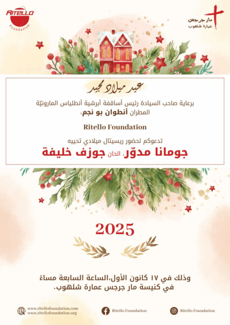 تنظم Ritello Foundation ريسيتالاً ميلادياً، برعاية صاحب السيادة رئيس أساقفة أبرشية أنطلياس المارونية المطران أنطوان بو نجم، تحييه المرنّمة جوانا مدوّر على ألحان جوزف خليفة، وذلك مساء 17 كانون الأول 2025 عند الساعة السابعة في كنيسة مار جرجس – عمارة شلهوب، حيث الدعوة مفتوحة أمام جميع الراغبين بالمشاركة في هذا اللقاء الميلادي الروحي.