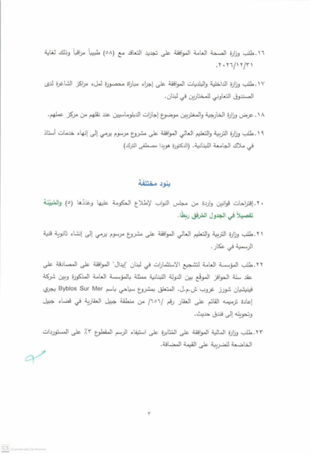 يعقد مجلس الوزراء جلسة عند الساعة الثالثة من بعد ظهر يوم الخميس، الواقع فيه 2026/1/8 في القصر الجمهوري لبحث المواضيع المبنية في جدول الأعمال المرفق.