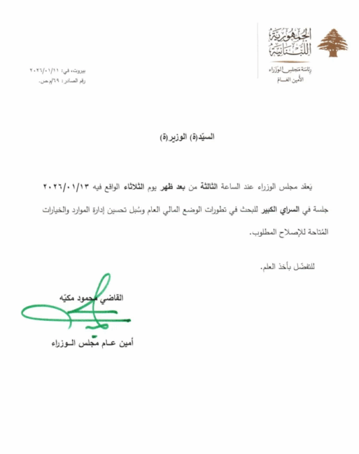 يعقد مجلس الوزراء عند الساعة الثالثة من بعد ظهر يوم الثلثاء الواقع فيه 13/01/2026 جلسة في السراي الكبير للبحث في تطورات الوضع المالي العام وسبل تحسين إدارة الموارد والخيارات المتاحة للإصلاح المطلوب.