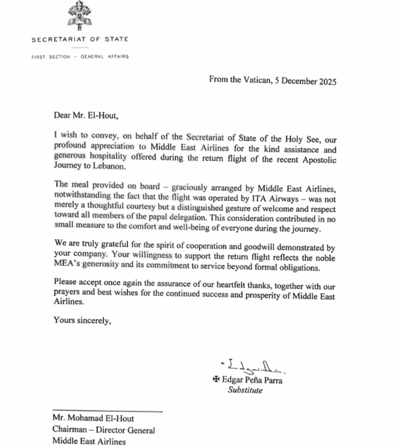 وختمت الرسالة بتجديد الشكر العميق، مقروناً بالصلوات وأطيب التمنيات باستمرار النجاح والازدهار لشركة طيران الشرق الأوسط.