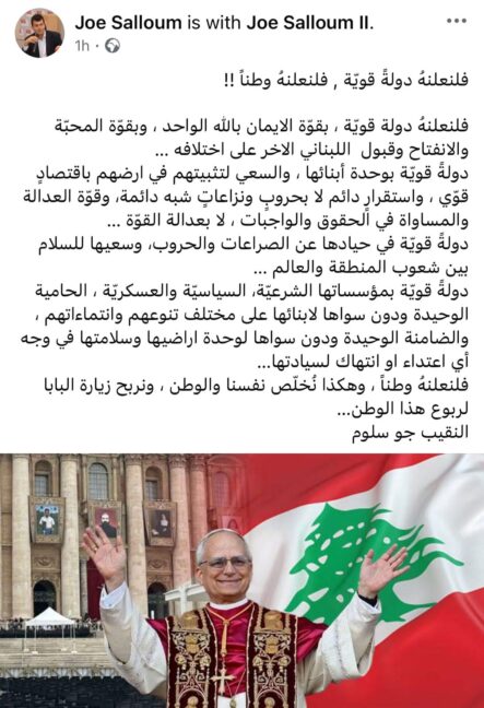 فلنعلنهُ وطناً ، وهكذا نُخلّص نفسنا والوطن ، ونربح زيارة البابا لربوع هذا الوطن".