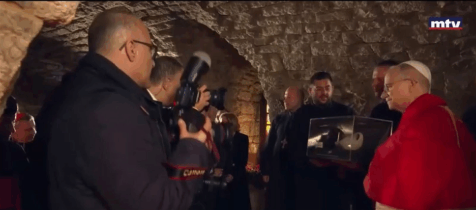 قدّم دير مار مارون عنايا للبابا أول طبعة للمزامير الصادرة عام 1610 من دير مار أنطونيوس قزحيا، إلى جانب سراج يدوي للقديس شربل يحوي ذخائره، وشمع عسلي صنعه الرهبان ويحمل الشعار البابوي.