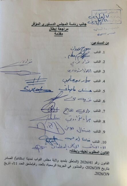 تقدّم النواب غسان حاصباني ورازي الحاج ونزيه متى عن نواب تكتل الجمهورية القوية والنواب فؤاد مخزومي وأشرف ريفي وميشال معوض، بمراجعة طعن أمام المجلس الدستوري لإبطال القانون رقم 41/2026 الصادر في 9 آذار 2026، والمتعلّق بتمديد ولاية مجلس النواب بصورة استثنائية. ويستند الطعن إلى اعتبار أن التمديد يشكّل مخالفة لأحكام الدستور اللبناني ولمبدأ دورية الانتخابات، إضافة إلى تعارضه مع المواثيق الدولية لحقوق الإنسان التي تكرّس حق المواطنين في اختيار ممثليهم عبر انتخابات حرّة ودورية.