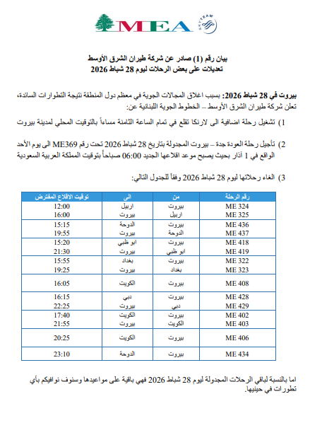 أصدرت شركة طيران الشرق الأوسط بيانا، أعلنت فيه تعديلات على بعض الرحلات اليوم، وذلك بسبب اغلاق المجالات الجوية في معظم دول المنطقة نتيجة التطورات السائدة.