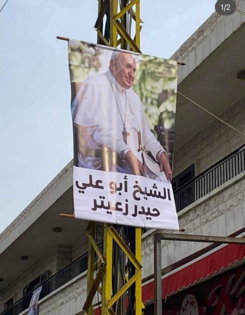 انتشرت خلال الساعات الماضية صورة لافتة على وسائل التواصل الاجتماعي تُظهر لافتة كبيرة معلّقة على أحد المباني في منطقة البقاع، تحمل صورة البابا فرنسيس على أنها صورة البابا لاوون الرابع عشر، وقد كُتب عليها: "الشيخ أبو علي حيدر زعيتر".