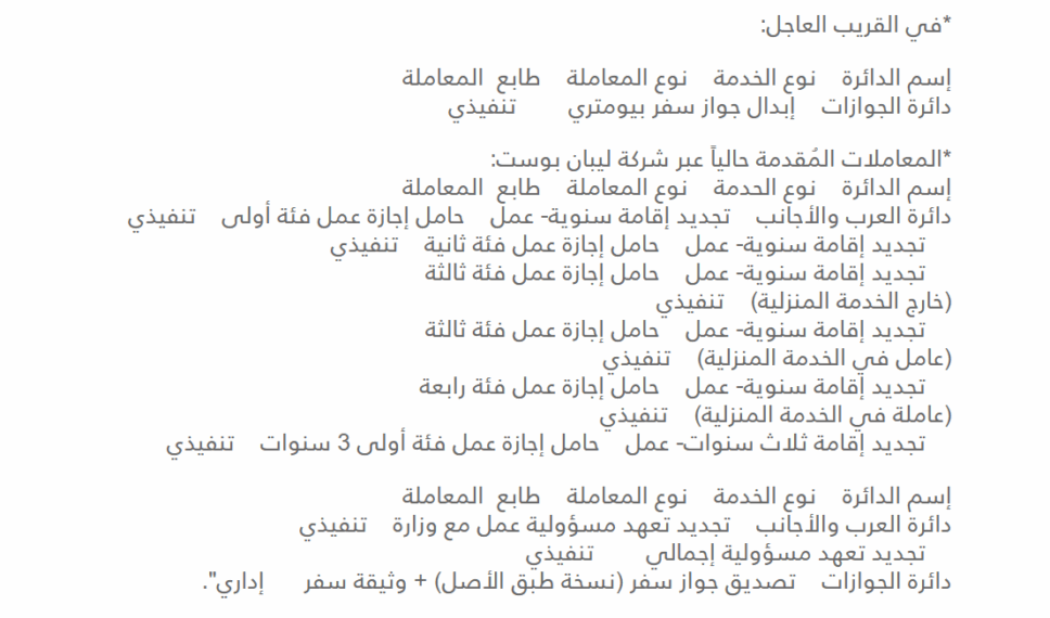 اعلنت المديرية العامة للأمن العام بدء شركة "ليبان بوست" اعتباراً من 15 تشرين الأول 2025 بإستقبال معاملات الأمن العام الجديدة بالإضافة إلى الخدمات المقدّمة عبرها حالياً وفقاً للجدول التالي: