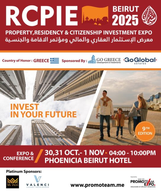 تستعدّ العاصمة بيروت لاستضافة معرض RCPiE Beirut 2025، الحدث الأبرز في مجال برامج الجنسية الثانية والإقامة عبر الاستثمار والسوق العقاري في لبنان برعاية المحافظ القاضي مروان عبّود، والذي تنظّمه شركة PromoTeam برئاسة إلياس الخوري، في نسخته التاسعة على التوالي، وذلك في فندق فينيسيا – بيروت على مدى ثلاثة أيام، من الخميس 30 تشرين الأول ولغاية السبت 1 تشرين الثاني 2025.