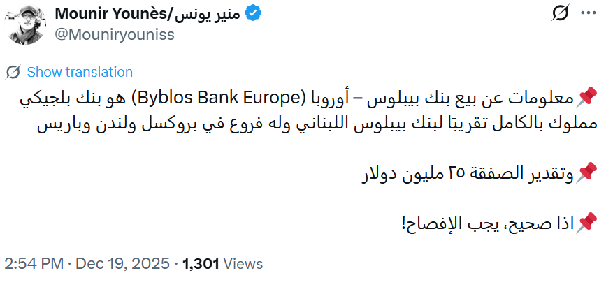 كما كتب يونس عن معلومات حول بيع بنك بيبلوس – أوروبا، وهو بنك بلجيكي مملوك بالكامل تقريباً لبنك بيبلوس اللبناني وله فروع في بروكسل ولندن وباريس، وتقدير الصفقة ٢٥ مليون دولار، مؤكداً أنه إذا صحت المعلومات، يجب الإفصاح عنها.