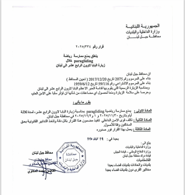 أصدر محافظ جبل لبنان محمد المكاوي قراراً يتعلّق بمنع ممارسة رياضة الـ paragliding خلال زيارة البابا لاوون الرابع عشر إلى لبنان.